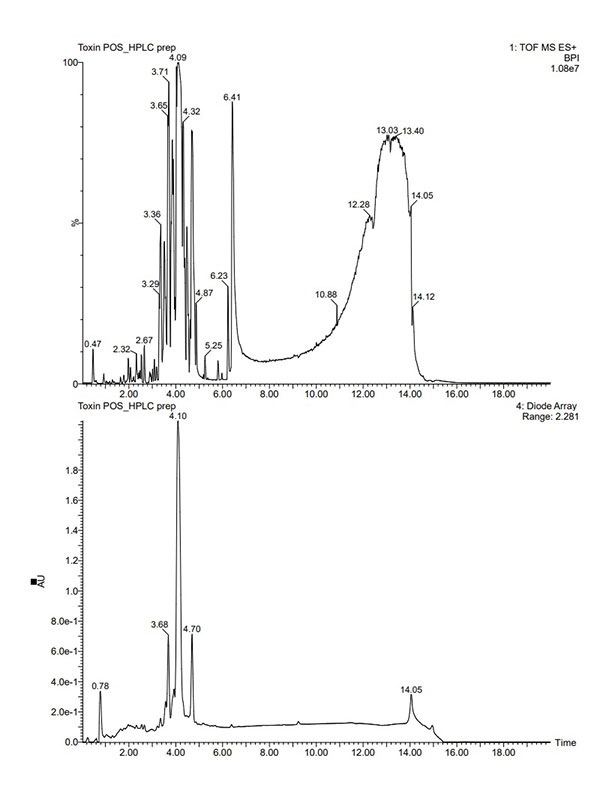 | TIC, BPI, UV chromatogram 제공 | UPLC profiling에서 target m/z 확인 (ex. m/z 524.3500) | 문헌 또는 제공된 STD 비교하여 추정되는 화합물 예상 |
