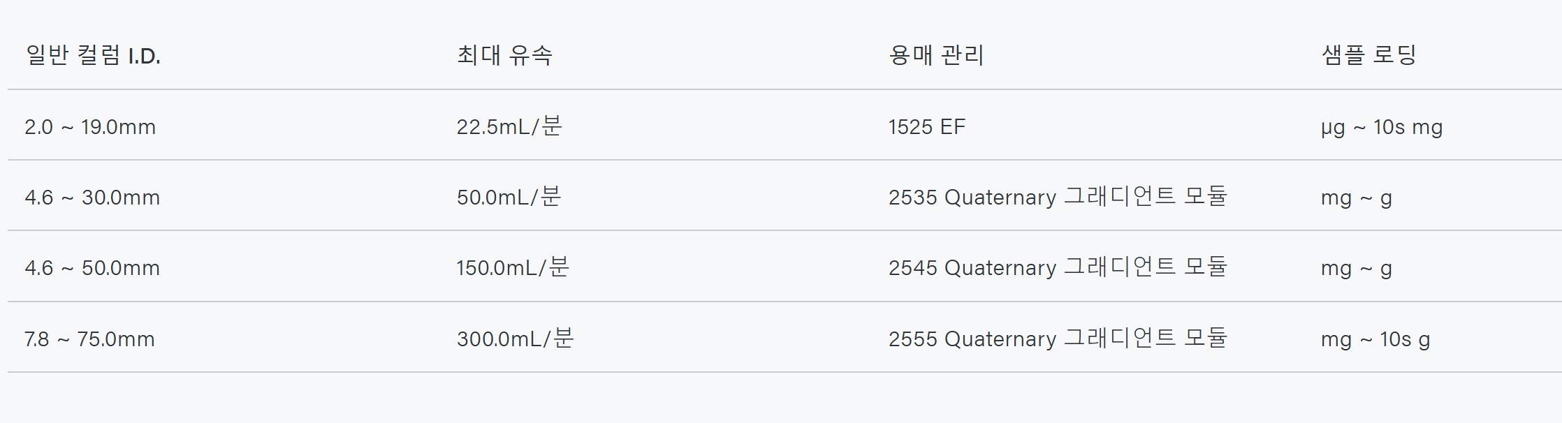 50mL/분의 용량은 최대 30mm 내경의 컬럼을 사용할 수 있어 밀리그램 수준의 물질 정제에 사용 가능