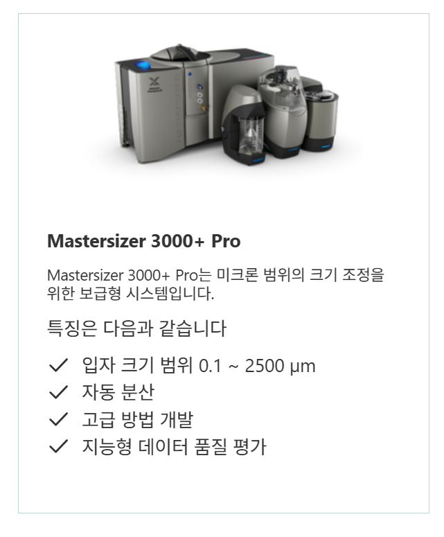 Mastersizer 3000+ Pro는 Mastersizer Xplorer의 고급 소프트웨어 옵션과 마이크론 단위의 크기 조정 기능이 필요한 응용 분야에 대해 최고 품질의 데이터를 생성합니다.