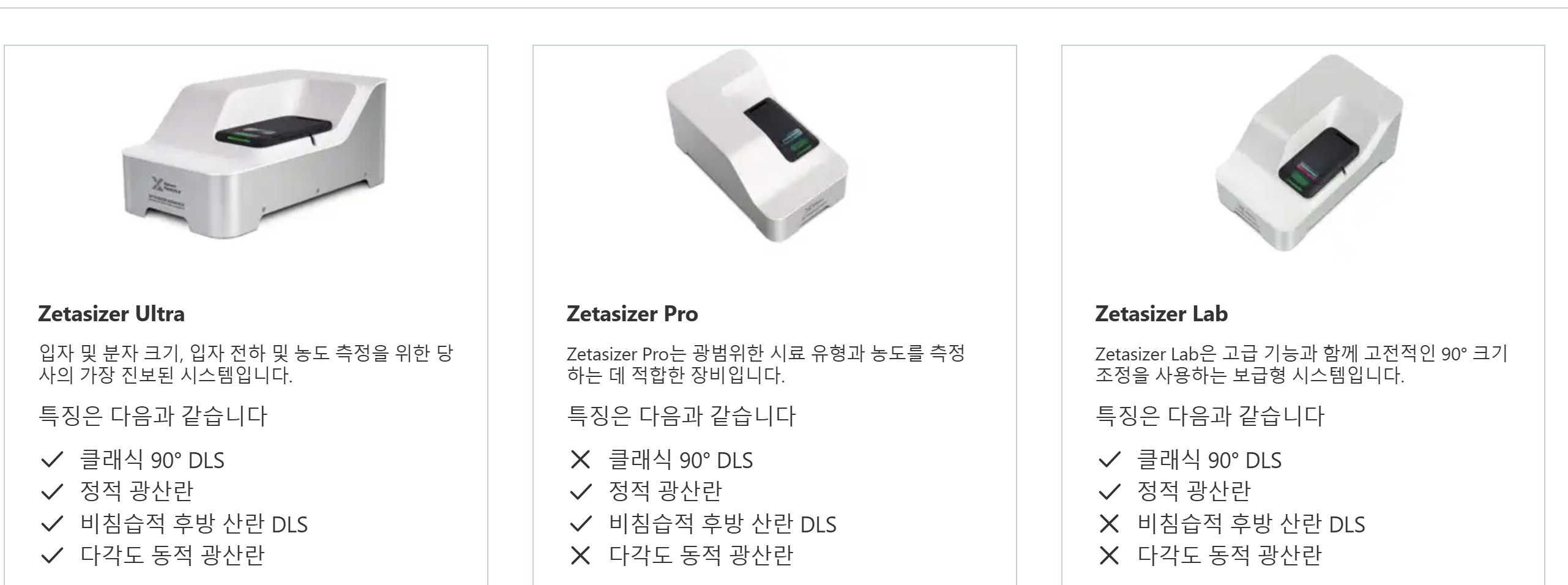 Zetasizer Advance 시리즈의 세 가지 모델은 각각 입자 크기, 입자 전하(제타 전위) 및 분자량 분석을 제공합니다. 또한 Adaptive Correlation, M3-PALS 제타 전위 분석, 정전류 제타 모드, 딥 러닝 기반 데이터 품질 조언 시스템을 포함한 최첨단 기술을 통해 다양한 혜택을 제공합니다.