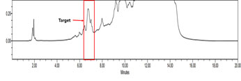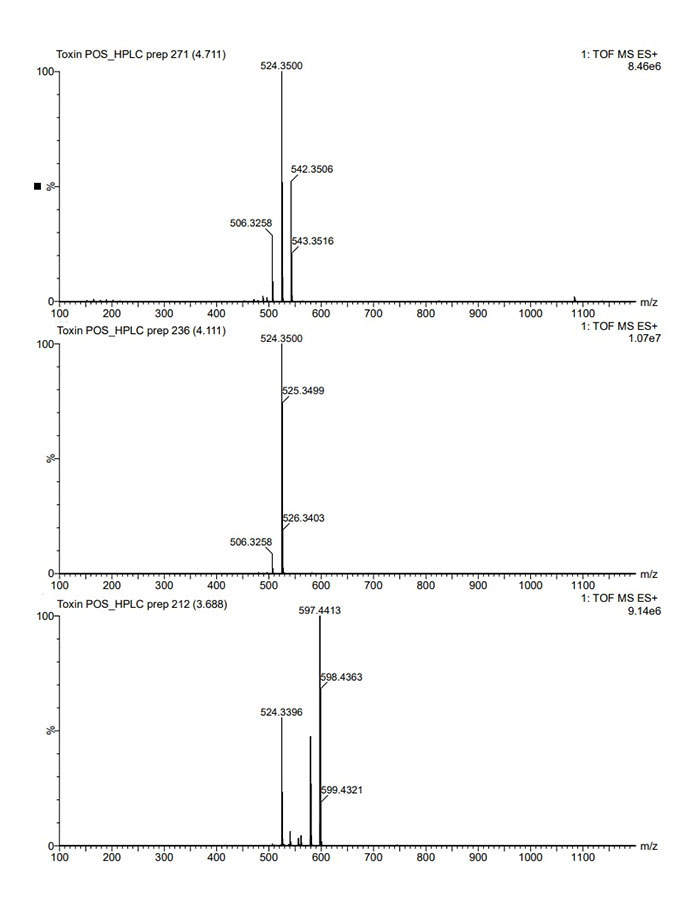 | TIC, BPI, UV chromatogram 제공 | UPLC profiling에서 target m/z 확인 (ex. m/z 524.3500) | 문헌 또는 제공된 STD 비교하여 추정되는 화합물 예상 |