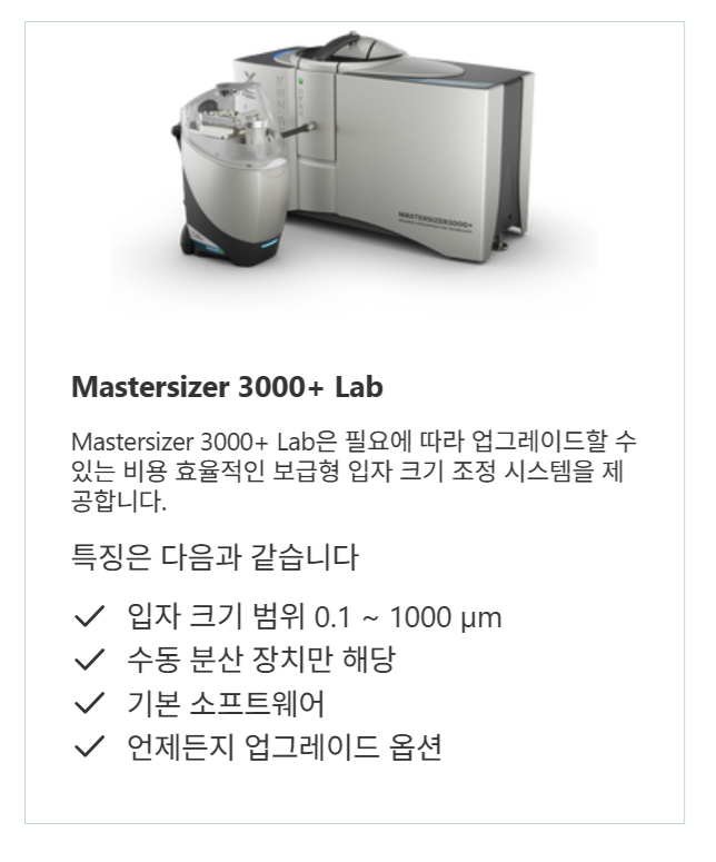 Mastersizer 3000+ Lab은 레이저 회절 원리를 이용한 기본형 입도 분석기입니다. 이 장비는 0.1~1,000µm의 정확한 입도 측정을 제공하며 Mastersizer Xplorer 소프트웨어의 핵심 경험을 활용할 수 있습니다.